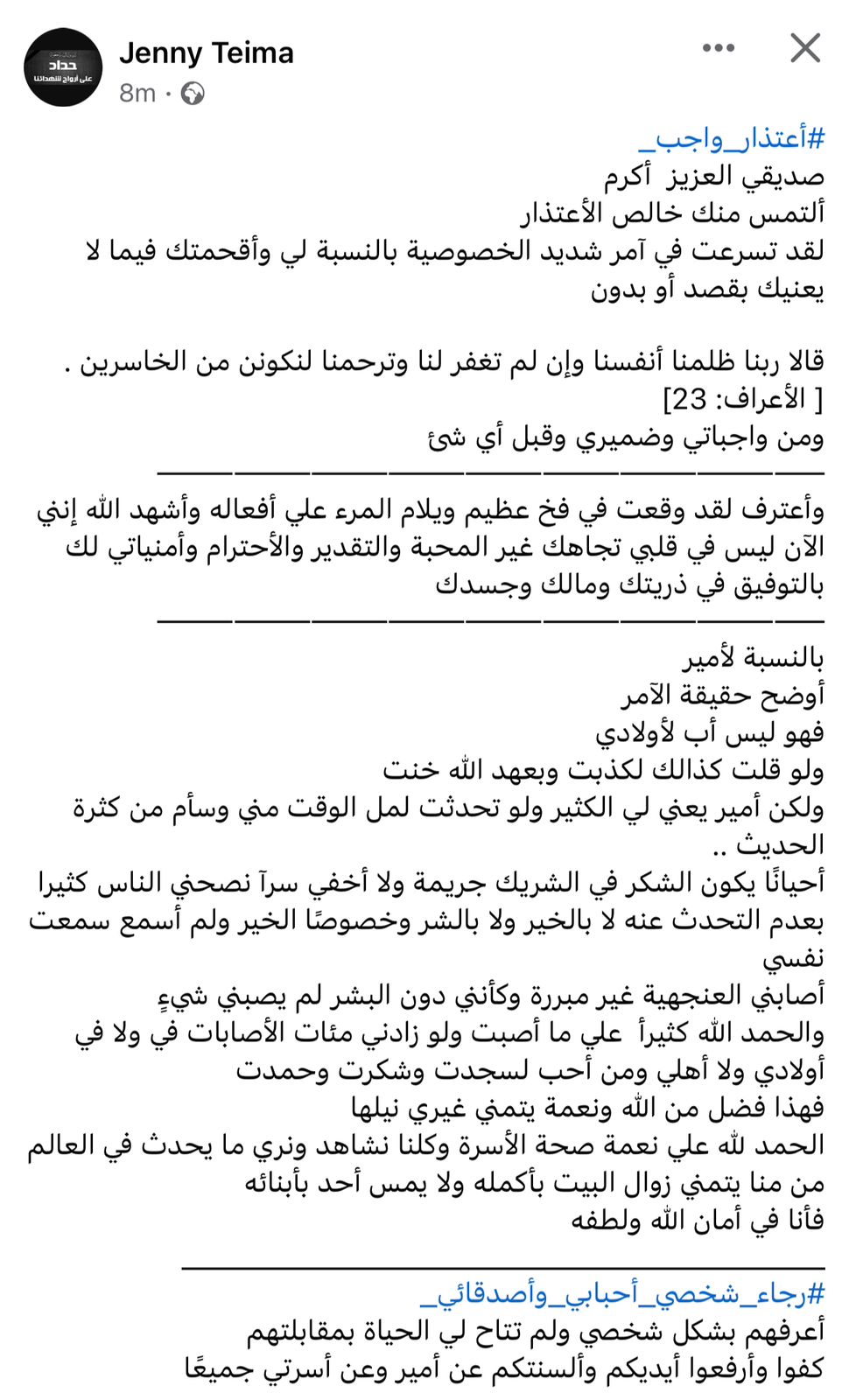 اعتذرت جنى، طليقة الشاعر أمير طعيمة، عن اتهامها للفنان أكرم حسني، بإنه سبب انفصالهم، وكتب منشور على صفحته الشخصية على موقع التواصل الإجتماعي "الفيسبوك".