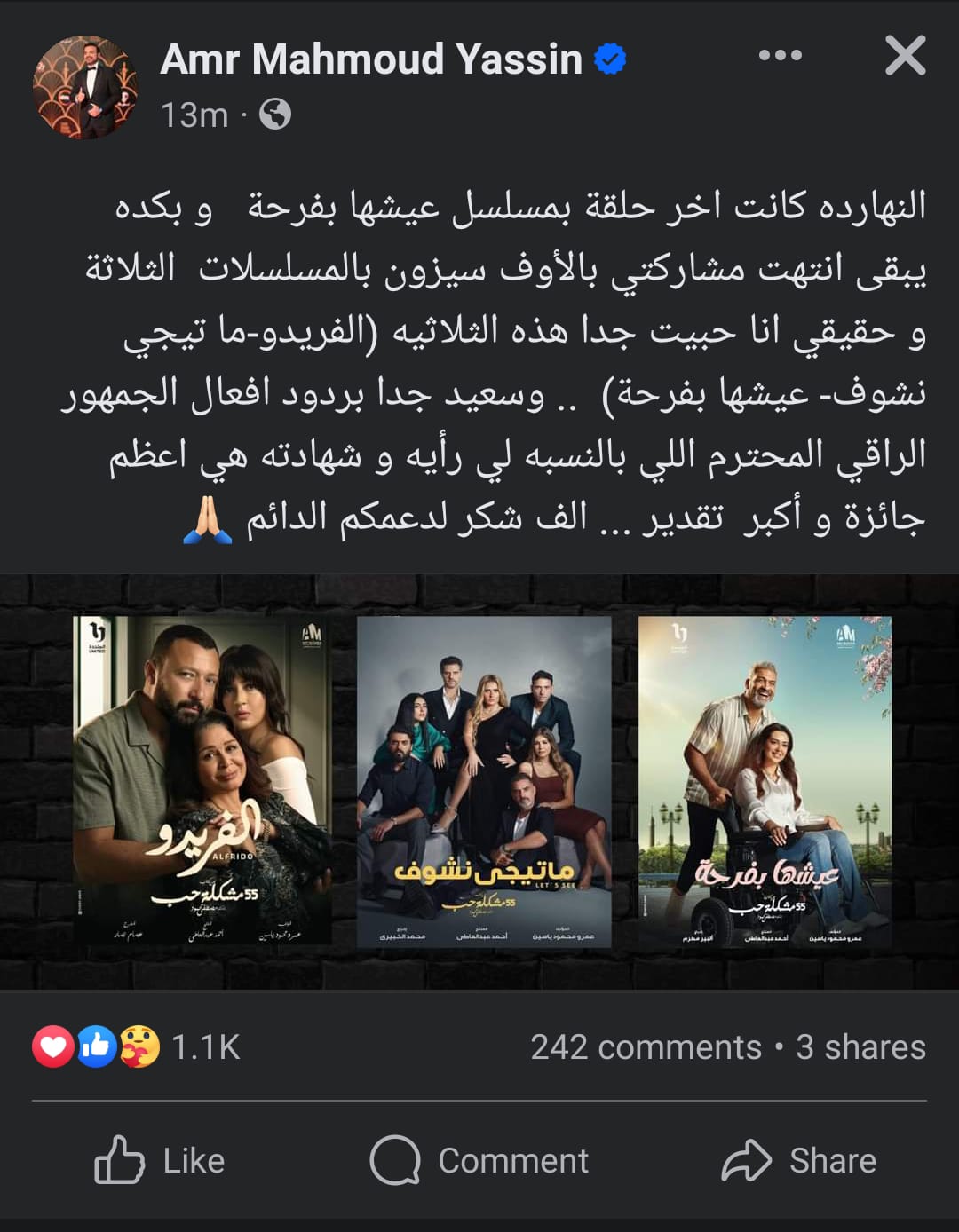 وكتب عمرو محمود ياسين منشور على صفحته الرسمية عبر موقع التواصل الاجتماعي "فيسبوك"، وعلق قائلا: "النهاردة كانت آخر حلقة بمسلسل عيشها بفرحة، وبكدة يبقى انتهت مشاركتي بالأوف سيزون بالمسلسلات التلاتة".