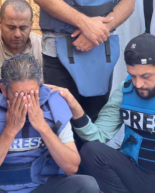 محمد ابو حطب .. حالة من البكاء سيطرت على المذيعة فور تلقيها خبر استشهاد زميلها المراسل محمد أبو حطب، ولم تتمالك أعصابها، وقام المراسل بخلع درع الحماية بينما تتساقط دموعه أيضا، قائلا: «هذه الدروع مجرد شعارات نرتديها نحن هنا ضحايا على الهواء مباشرة نفقد واحدا تلو الأخر بلا ثمن، نحن ننتظر الدور واحد تلو الأخر»، مشيرا إلى أن زميله محمد أبو حطب كان في نفس المكان منذ نصف ساعة قبل استشهاده.