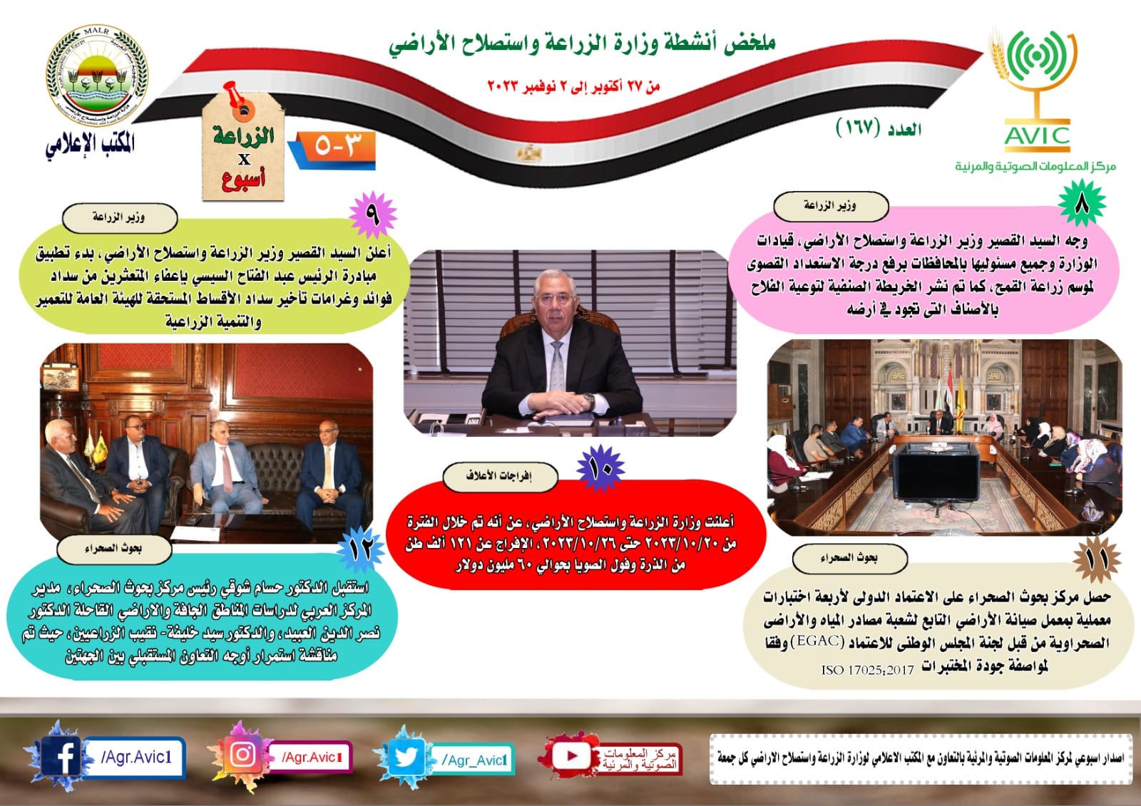 أصدر مركز المعلومات الصوتية والمرئية، التابع لوزارة الزراعة واستصلاح الأراضي، "الانفوجراف الأسبوعي" في نسخته رقم 167 ، حول الحصاد الأسبوعي لأهم أنشطة الوزارة، خلال الأسبوع الماضي في الفترة من 27 أكتوبر وحتى 2 نوفمبر الجاري، وذلك بالتعاون مع المكتب الإعلامي للوزارة، كما أصدر المركز أيضا ملخصا بالفيديو، حول أنشطة الوزارة خلال نفس الفترة.