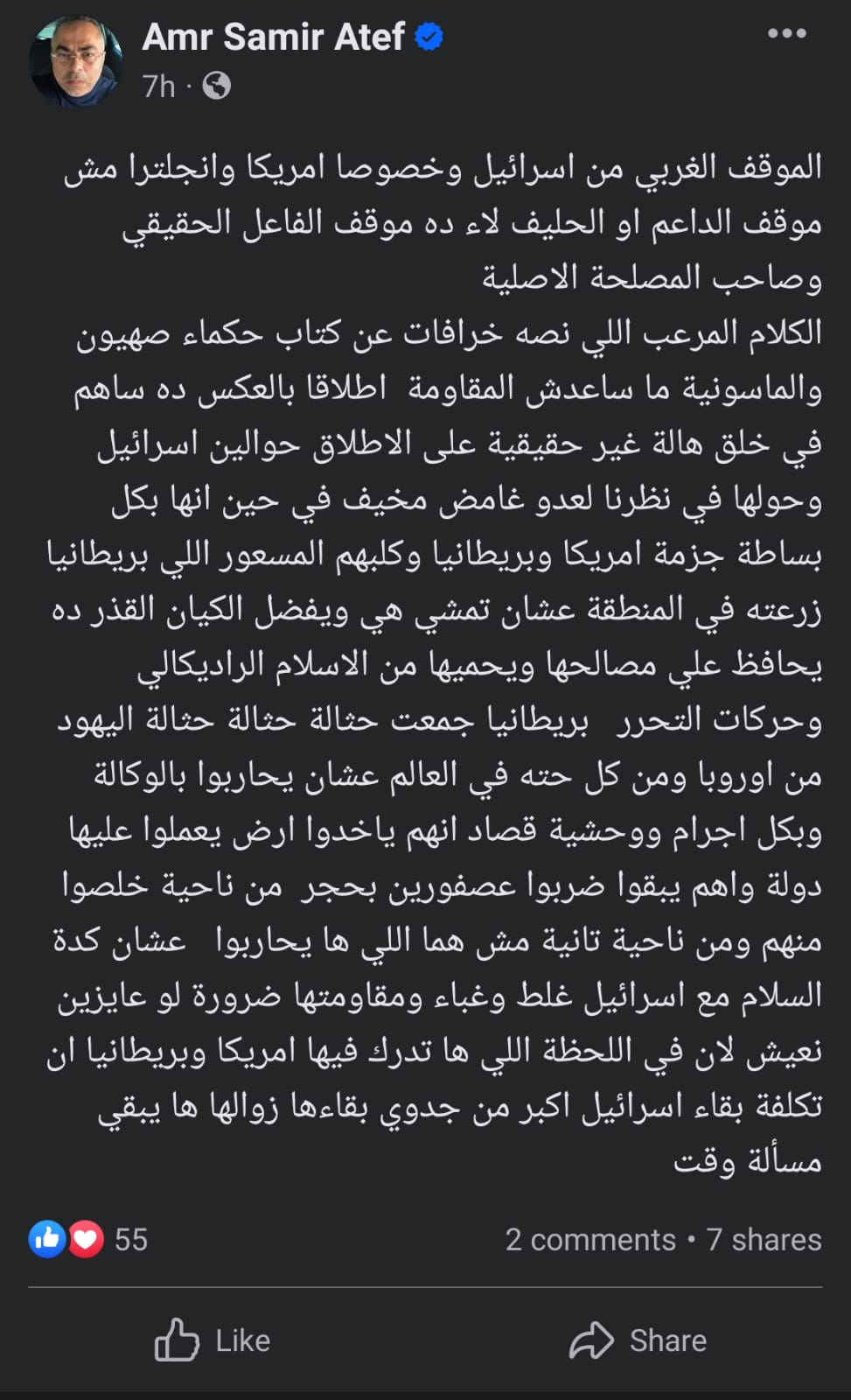 وكتب عمرو سمير عاطف منشور على صفحته الرسمية عبر موقع التواصل الاجتماعي فيسبوك وعلق قائلا " الموقف الغربي من إسرائيل وخصوصا أمريكا وانجلترا مش موقف الداعم أو الحليف، لا ده موقف الفاعل الحقيقي وصاحب المصلحة الأصلية " .