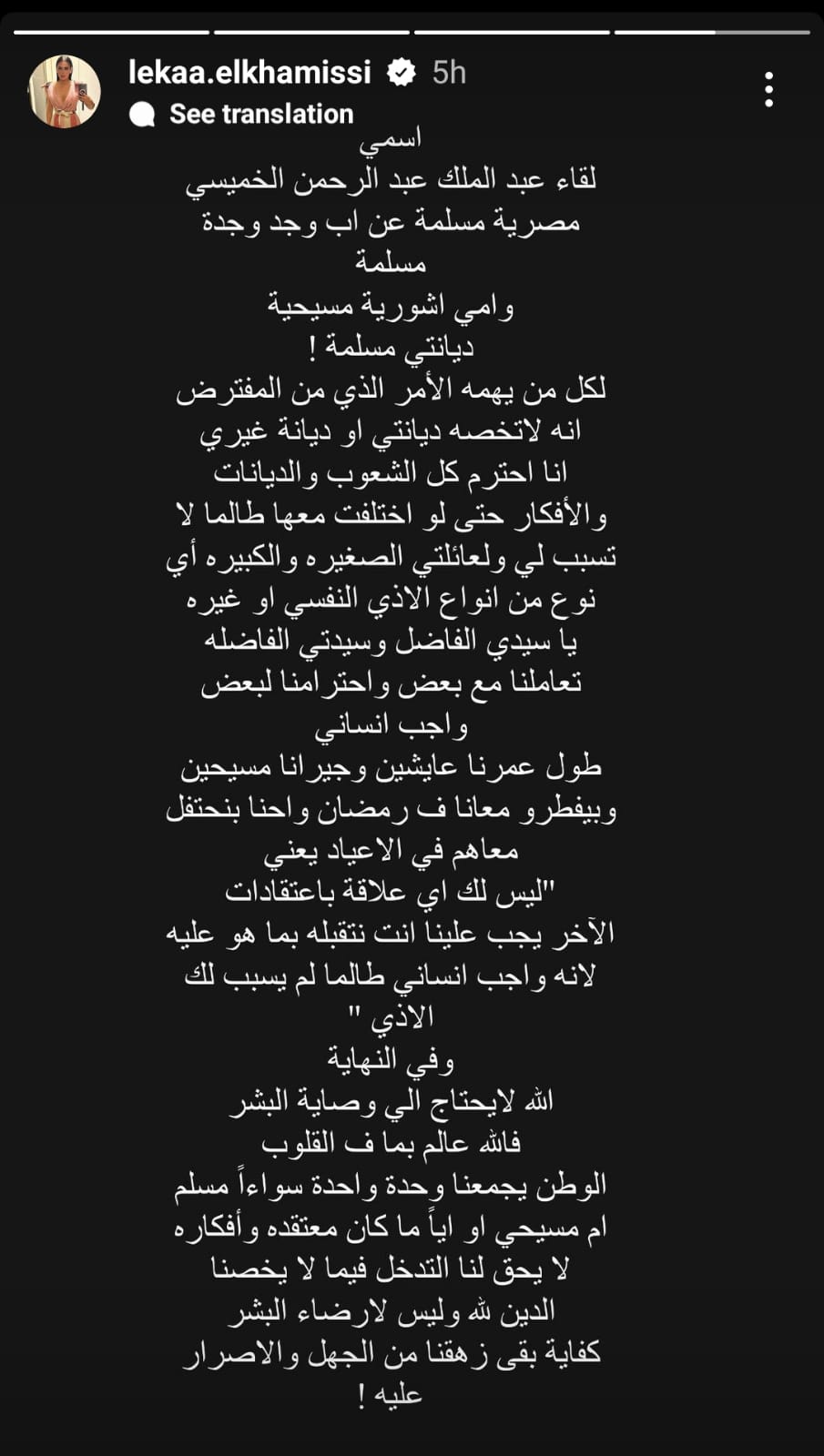 وكتبت لقاء الخميسي عبر حسابها بموقع تبادل الصور والفيديوهات إنستجرام وعلقت قائلة "اسمي لقاء عبد الملك عبد الرحمن الخميسي مصرية مسلمة عن أب وجد وجدة مسلمة، وأمي أشورية مسيحية، وديانتي مسلمة لكل من يهمه الأمر الذي من المفترض أنه لا تخصه ديانتي أو ديانة غيري، أنا احترم كل الشعوب والديانات والأفكار حتى لو اختلفت معها طالما لا تسبب لي ولعائلتي الصغيرة والكبيرة أي نوع من أنواع الأذى النفسي أو غيره يا سيدي الفاضل وسيدتي الفاضلة مع بعض واحترامنا لبعض واجب إنساني"