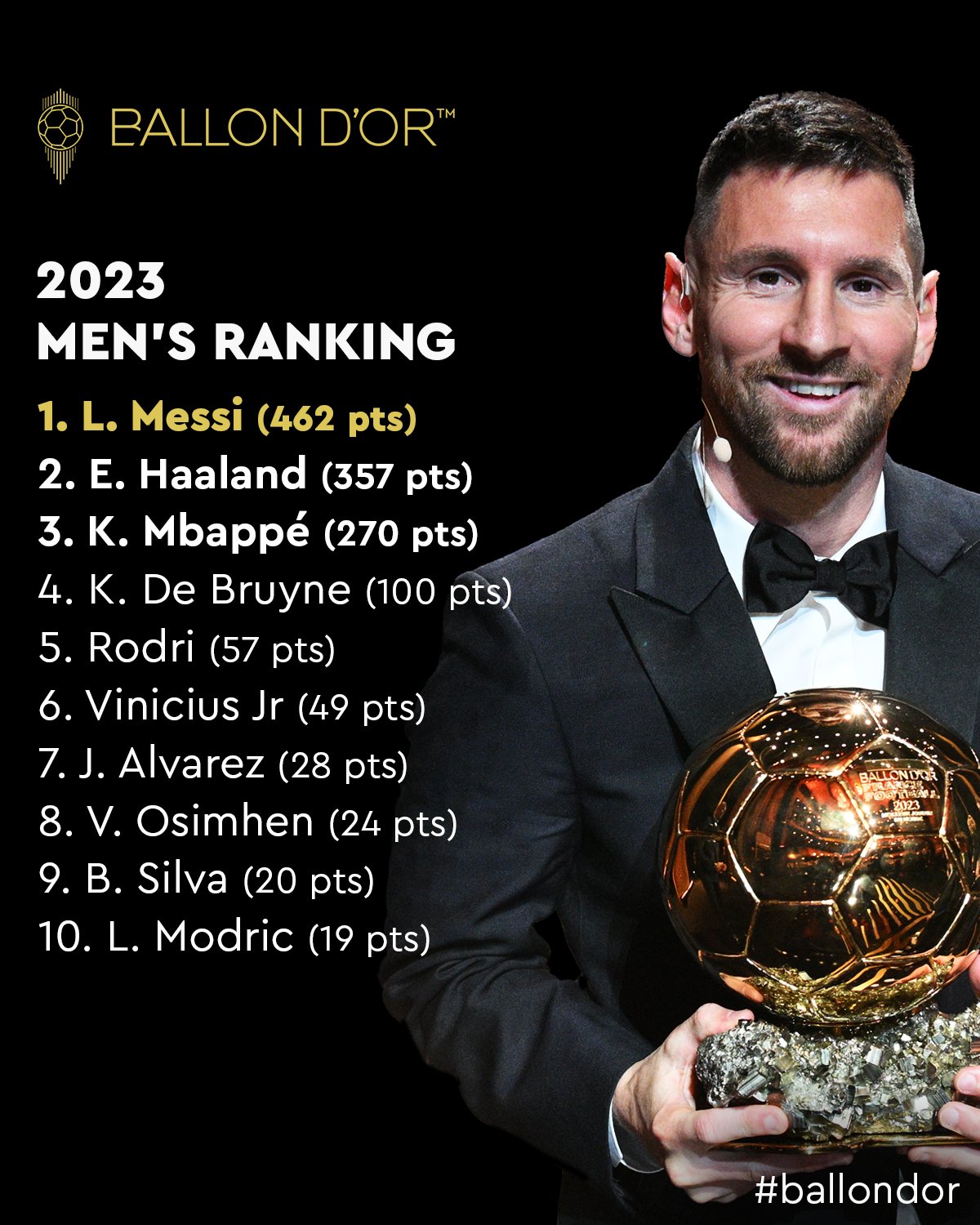 وحصد ميسي لاعب إنتر ميامي وقائد منتخب الأرجنتين الجائزة بـ 462 نقطة، يليه إيرلينج هالاند مهاجم مانشستر سيتي بـ357 نقطة.
