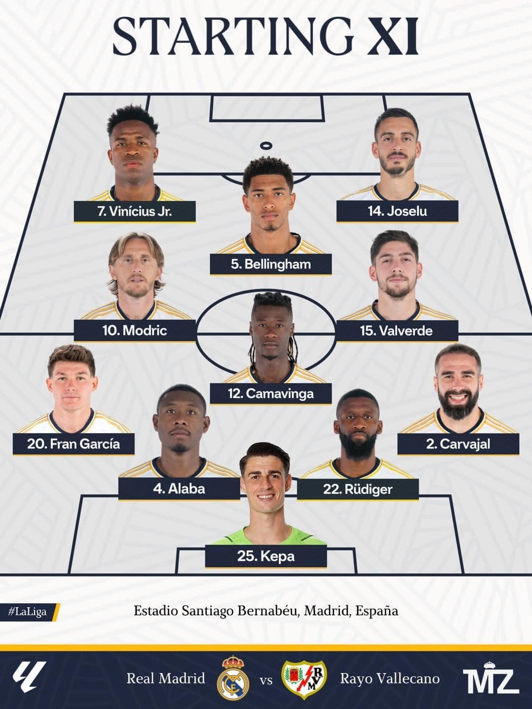 خط الوسط: بيلينجهام، كروس، مودريتش، كامافينجا، فالفيردي، تشواميني.
