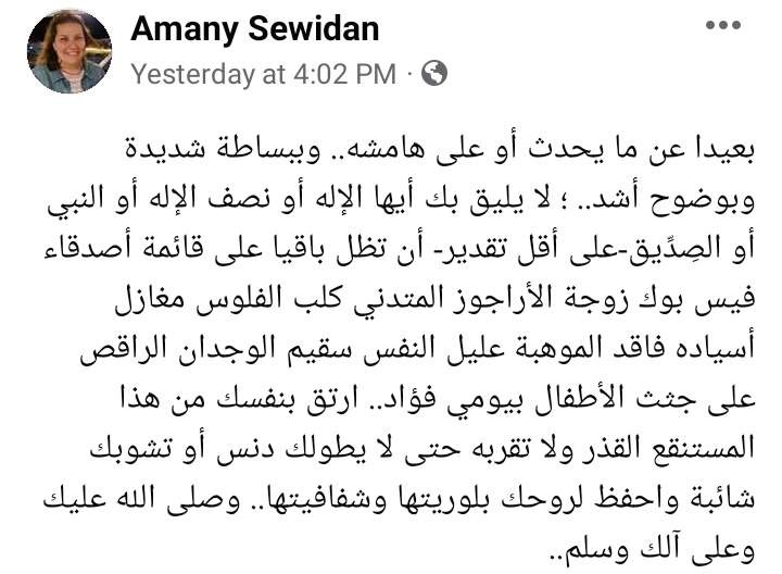 وقالت زوجة بيومي فؤاد، عبر صفحتها الشخصية على موقع التواصل الاجتماعي “فيسبوك”: “بعيدا عما يحدث أو على هامشه.. وببساطة شديدة وبوضوح أشد؛ لا يليق بك أيها الإله أو نصف الإله أو النبي أو الصِدِّيق -على أقل تقدير- أن تظل باقيا على قائمة أصدقاء فيسبوك زوجة الأراجوز المتدني كلب الفلوس مغازل أسياده فاقد الموهبة عليل النفس سقيم الوجدان الراقص على جثث الأطفال بيومي فؤاد”.