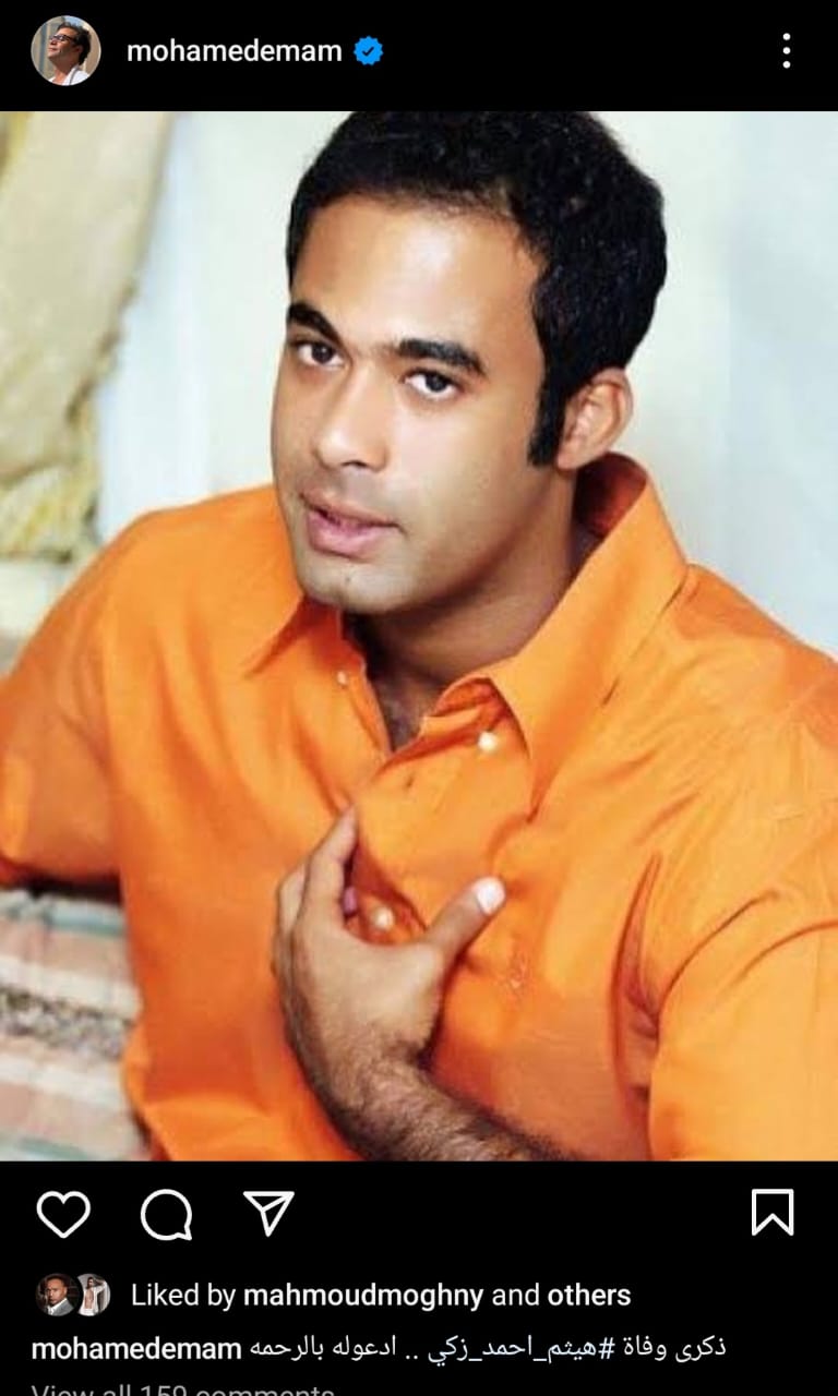 وشارك محمد إمام جمهوره بصورة لـ"هيثم أحمد زكي"إحياءا لذكراه الرابعة لوفاته، وكتب"ذكرى وفاة هيثم أحمد زكي إدعوله بالرحمة".
