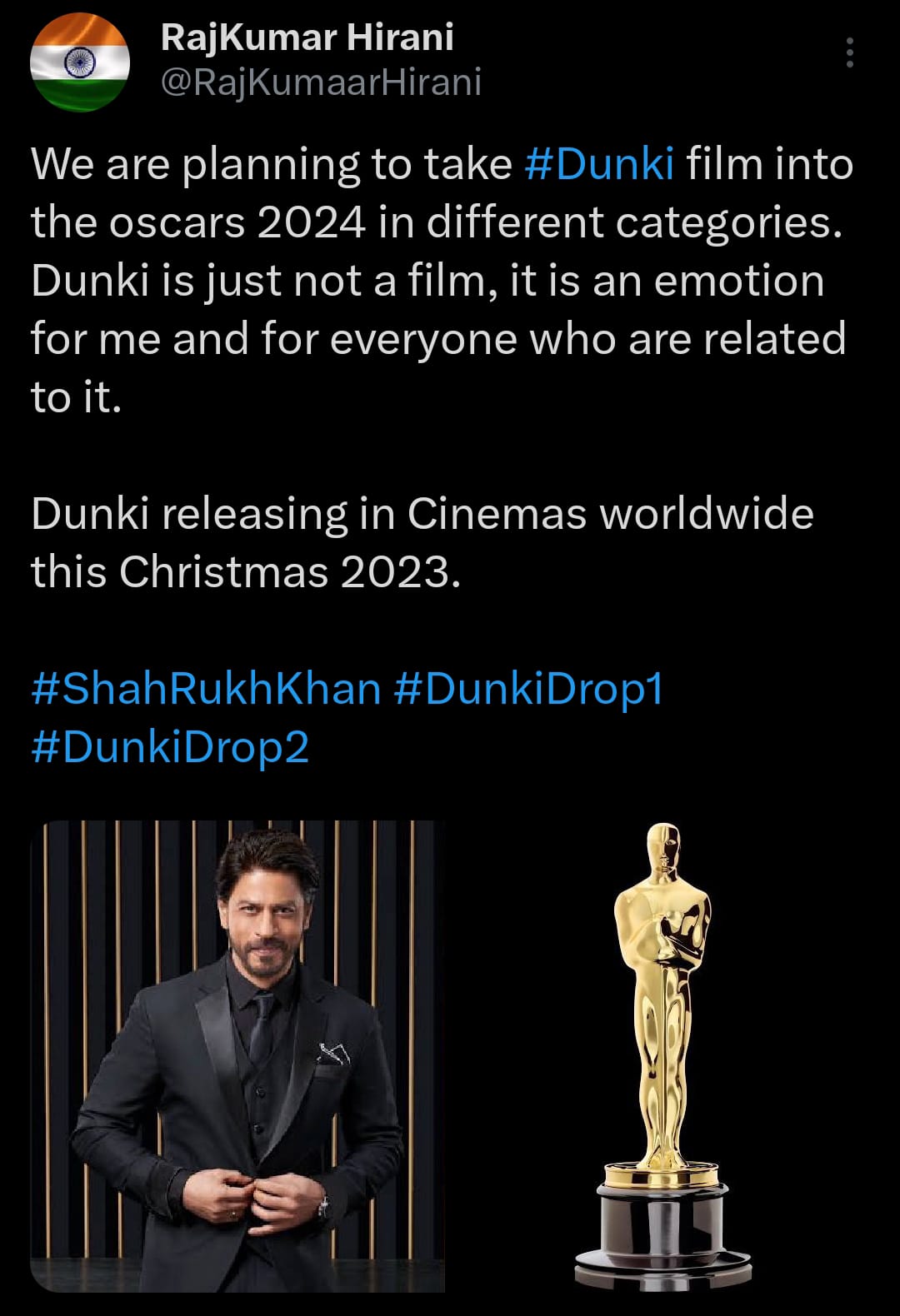 كتب راجكومار هيراني تغريدة على صفحته الرسمية عبر موقع التواصل الاجتماعي " إكس"، وعلق قائلا": "أخطط لأخذ فيلم Dunki إلى حفل جوائز الأوسكار 2024 في فئات مختلفة "، وتابع: " Dunki ليس مجرد فيلم، بل هو عاطفة بالنسبة لي ولكل من يرتبط به " .