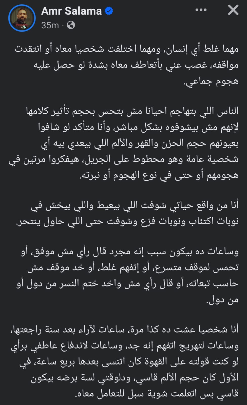كتب عمرو سلامة منشور على صفحته الرسمية عبر موقع التواصل الاجتماعي " فيسبوك" وعلق قائلا ": مهما غلط أي إنسان ومهما اختلفت شخصيا معاه أو انتقدت مواقفه غصب عني بتعاطف معاه بشدة لو حصل عليه هجوم جماعي ".