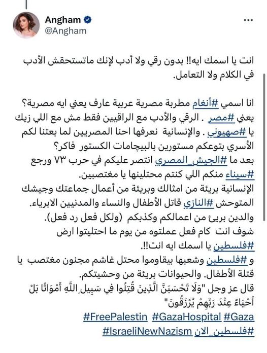 انغام.. وتابعت انغام: "الرقي والأدب مع الراقيين فقط مش مع اللي زيك يا صهيونى، والإنسانية نعرفها احنا المصريين لما بعتنا لكم الأسري بتوعكم مستورين بالبيجامات الكستور فاكر؟ بعد ما الجيش المصرى انتصر عليكم في حرب 73 ورجع سيناء منكم اللي كنتم محتلينها يا مغتصبين".