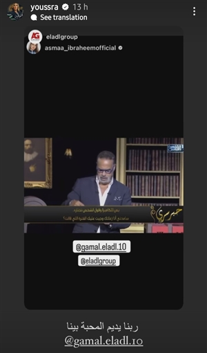 أعادت يسرا نشر فيديو لجمال العدل من برنامج "حبر سري" عبر خاصية القصص القصيرة في حسابها على انستجرام، وفيه تحدث عنها واعتذر لها، وكتبت تعليقا: "ربنا يديم المحبة بينا".