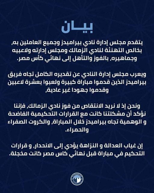 يتقدم مجلس إدارة نادي بيراميدز وجميع العاملين به، بخالص التهنئة لنادي الزمالك ومجلس إدارته ولاعبيه وجماهيره، بالفوز والتأهل إلى نهائي كأس مصر.