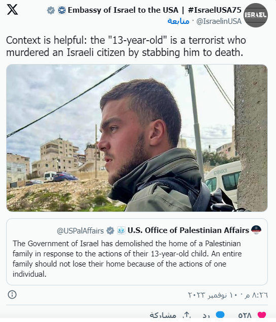 فقد نشر المكتب الأمريكي للشؤون الفلسطينية على موقع X، تغريدة قال فيها إن حكومة إسرائيل هدمت منزل عائلة فلسطينية رداً على تصرفات طفلها البالغ من العمر 13 عاماً، مضيفًا أنه لا ينبغي لعائلة بأكملها أن تفقد منزلها بسبب تصرفات فرد واحد.