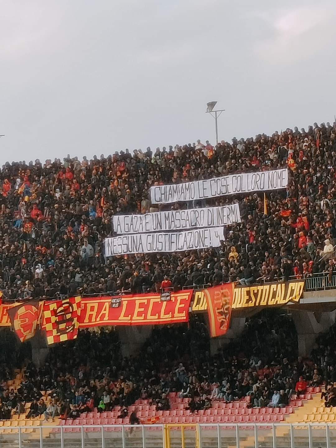 يواجه فريق ليتشي خصمه اي سي ميلان، في إطار الدوري الإيطالي، ومع مجريات المباراة قام جمهور ليتشي برفع لافته كبير تناصر غزه من العدوان الإسرائيلي الغاشم، المقام عليها منذ شهر من الكيان الصهيوني.