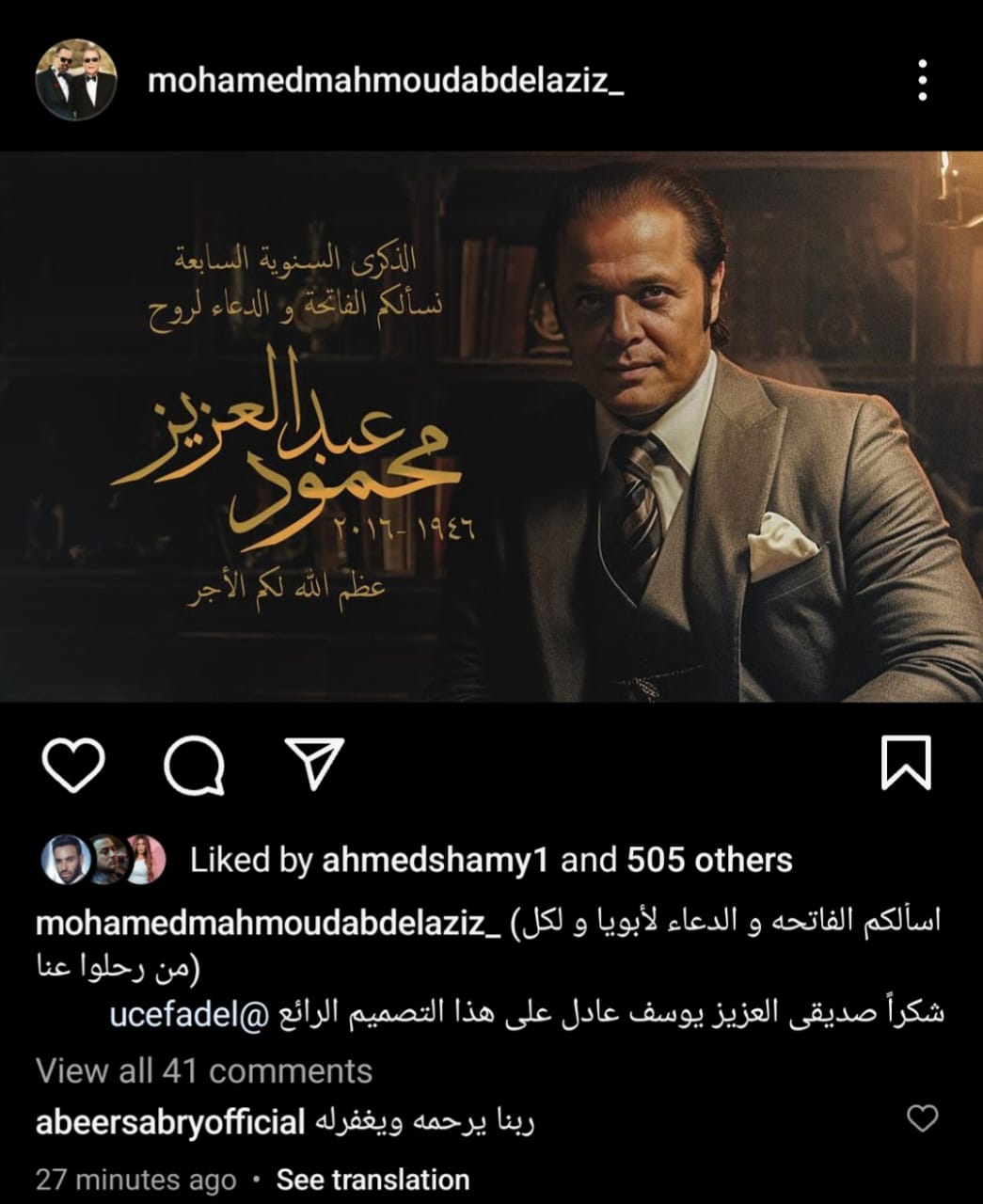 طلب الفنان محمد محمود عبدالعزيز، من جمهوره الدعاء لوالده الفنان الراحل محمود عبدالعزيز، في الذكرى السنوية السابعة لوفاته والتي ستحل غدًا.