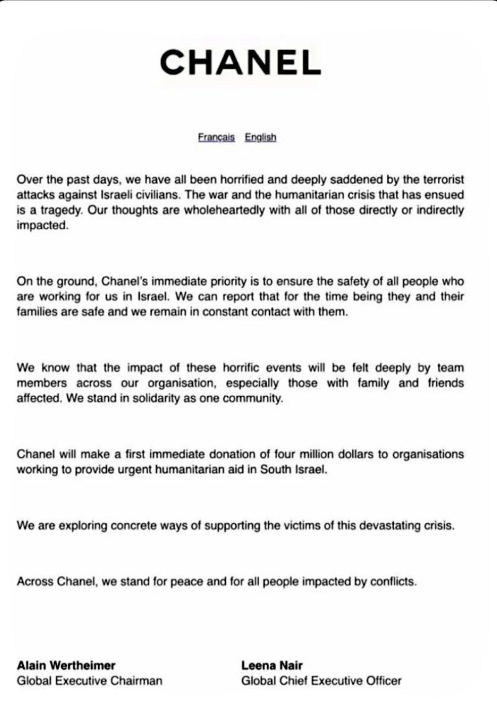 أصدر آلان فيرتهايمر، رجل أعمال وملياردير فرنسي يقيم في مدينة نيويورك، وهو رئيس مجلس الإدارة والمساهم المسيطر في شانيل، بيانًا رسميًا أدان فيه أحداث السابع من أكتوبر، وأكد أنه يبحث طرق ملموسة لدعم ضحايا هذه الأحداث وعائلاتهم، والتزم الصمت تجاه الأحداث الدموية في غزة.