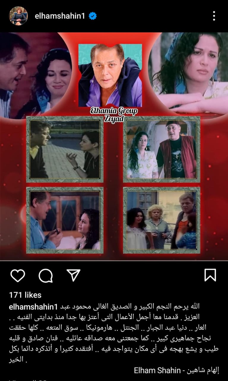 كتبت إلهام"الله يرحم النجم الكبير والصديق الغالي محمود عبدالعزيز، قدمنا معا أجمل الأعمال التي اعتز بها جدا منذ بدايتي الفنية العار، دنيا عبدالجبار، الجنتل، هارمونيكا، سوق المتعة، كلها حققت نجاح جماهيري كبير كما جمعتني بها صداقة عائلي فنان صادق وقلبه طيب ويشع بهجه في أي مكان يتواجد فيه أفتقده كثيرا وأتذكره دائما بكل الخير.