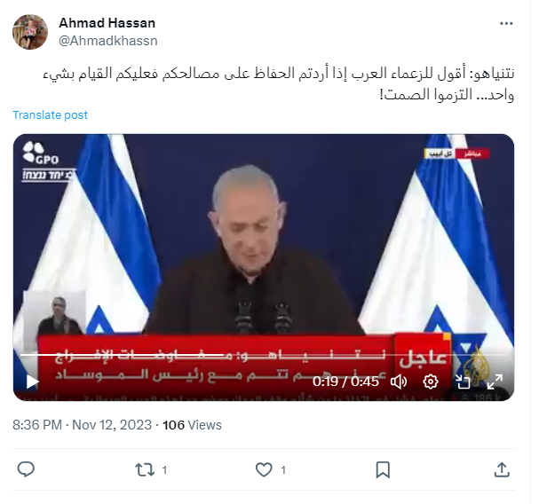 تداول مستخدمي مواقع التواصل الاجتماعي، فيديو من مؤتمر صحفي لرئيس الوزراء الإسرائيلي، بنيامين نتنياهو، خلال توجيه تحذير للقادة العرب بتهدأه الخطاب على إسرائيل ومهاجمة حركة حماس، مشيرا إلى ربط هذه الأحاديث بمناصبهم، وهو ما استنكره متداولي الفيديو.