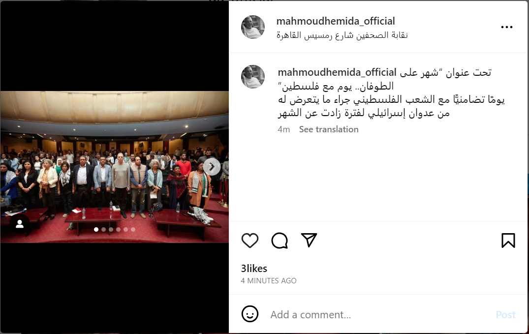 نشر الفنان محمود حميدة صورة على صفحته الرسمية عبر موقع تبادل الصور والفيديوهات إنستجرام وعلق قائلا " تحت عنوان شهر على الطوفان .. يوم مع فلسطين " .