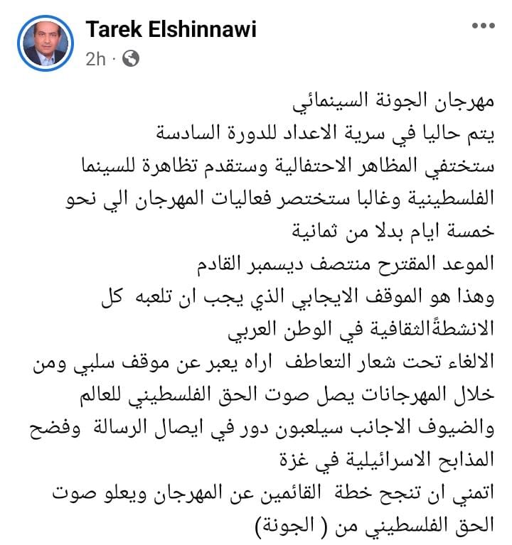 وقال الشناوي في منشور على حسابه: "مهرجان الجونة السينمائي، يتم حاليًا في سرية الإعداد للدورة السادسة، وستختفي المظاهر الاحتفالية، وستقدم تظاهرة للسينما الفلسطينية، وغالبا ستختصر فعاليات المهرجان إلى نحو خمسة، أيام بدلًا من ثمانية، الموعد المقترح منتصف ديسمبر القادم".