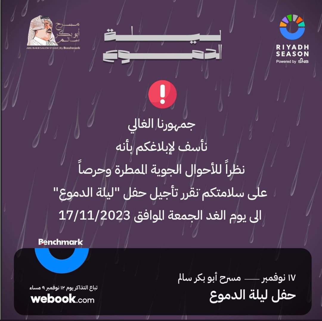 تأجيل حفل ليلة الدموع بالرياض بسبب الأحوال الجوية