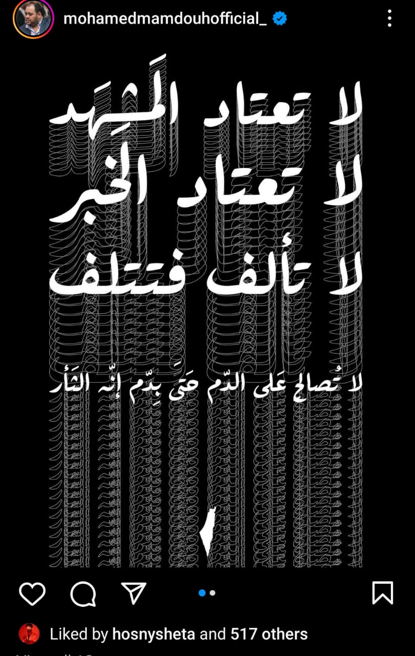 طالب الفنان محمد ممدوح متابعيه بعدم التوقف عن دعم القضية الفلسطينية والتضامن مع الأحداث الأخيرة بفلسطين في الوقت الحالي .