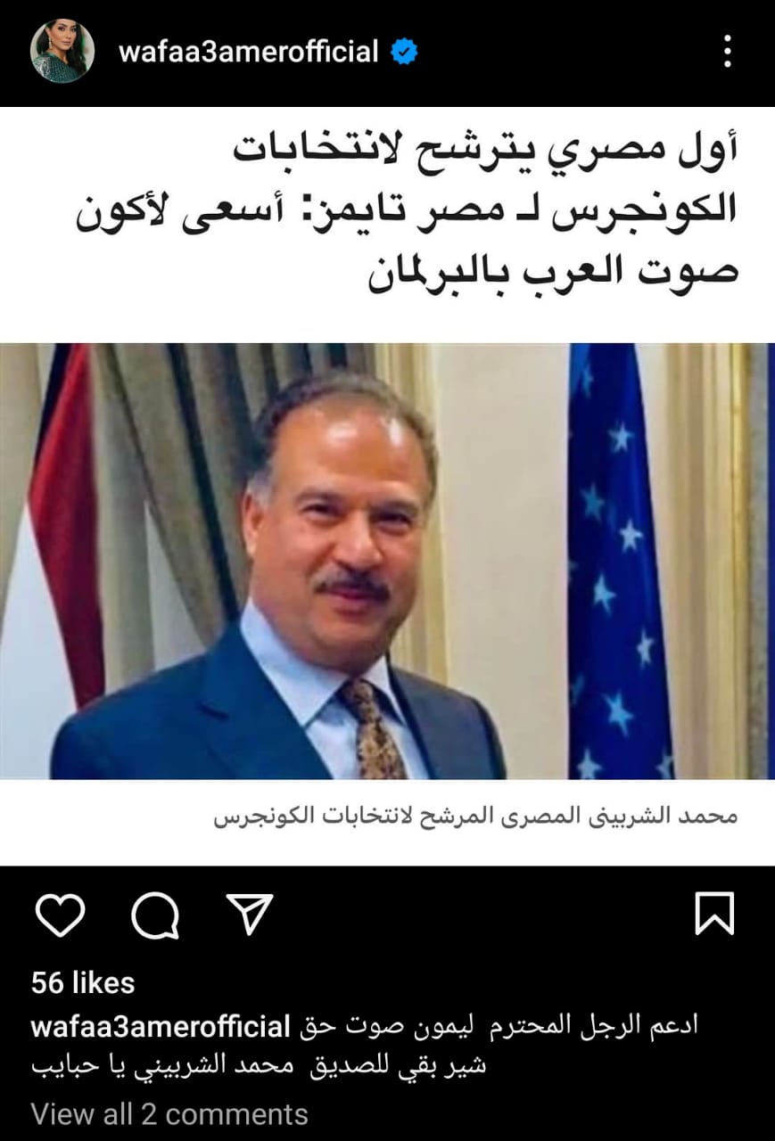 أعلنت الفنانة وفاء عامر عن دعمها لمحمد الشربيني المرشح لانتخابات الكونجرس الأمريكي وذلك من خلال نشرها لصورة على صفحتها الرسمية عبر موقع تبادل الصور والفيديوهات " إنستجرام " .