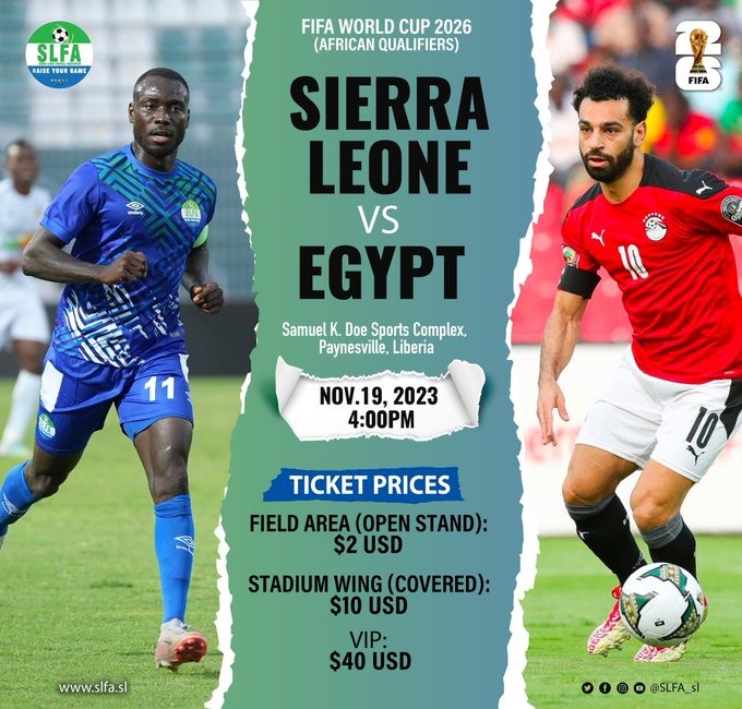 يطرح الاتحاد السيراليوني لكرة القدم تذاكر مباراة منتخب مصر مع سيراليون المحدد لها اليوم الأحد فى السادسة مساءً بتوقيت القاهرة فى ليبيريا لعدم صلاحية ملاعب سيراليون لاستضافة مباريات على أرضها حسب تعليمات الاتحاد الدولي لكرة القدم.