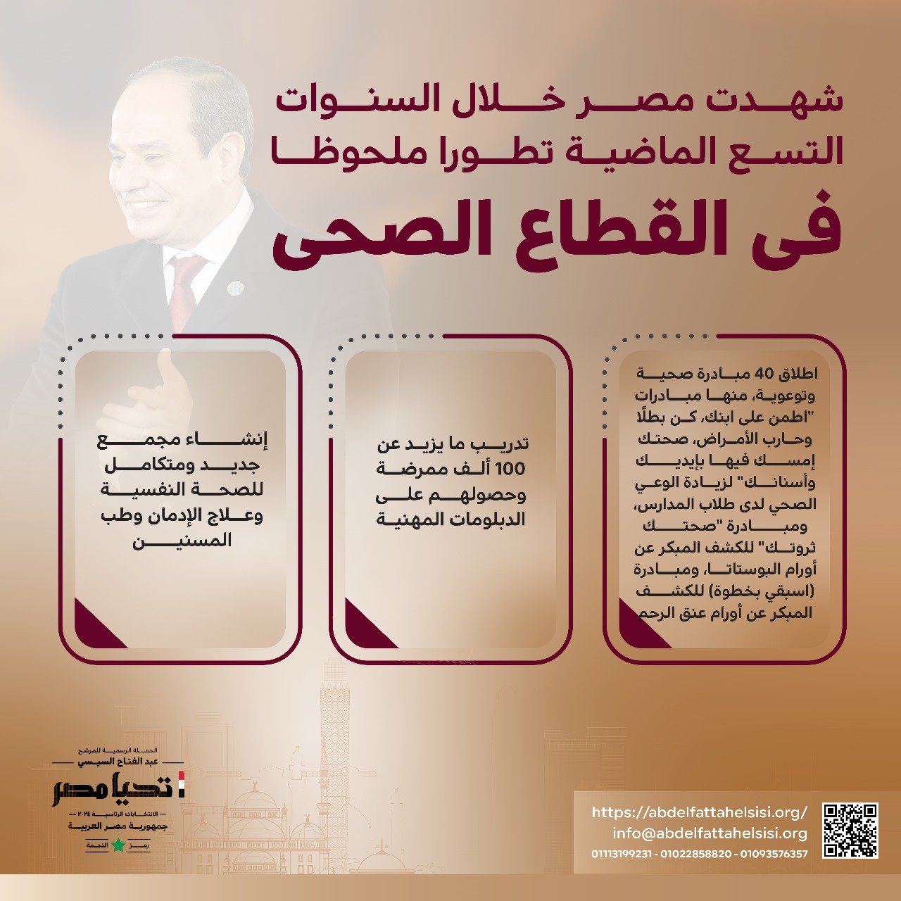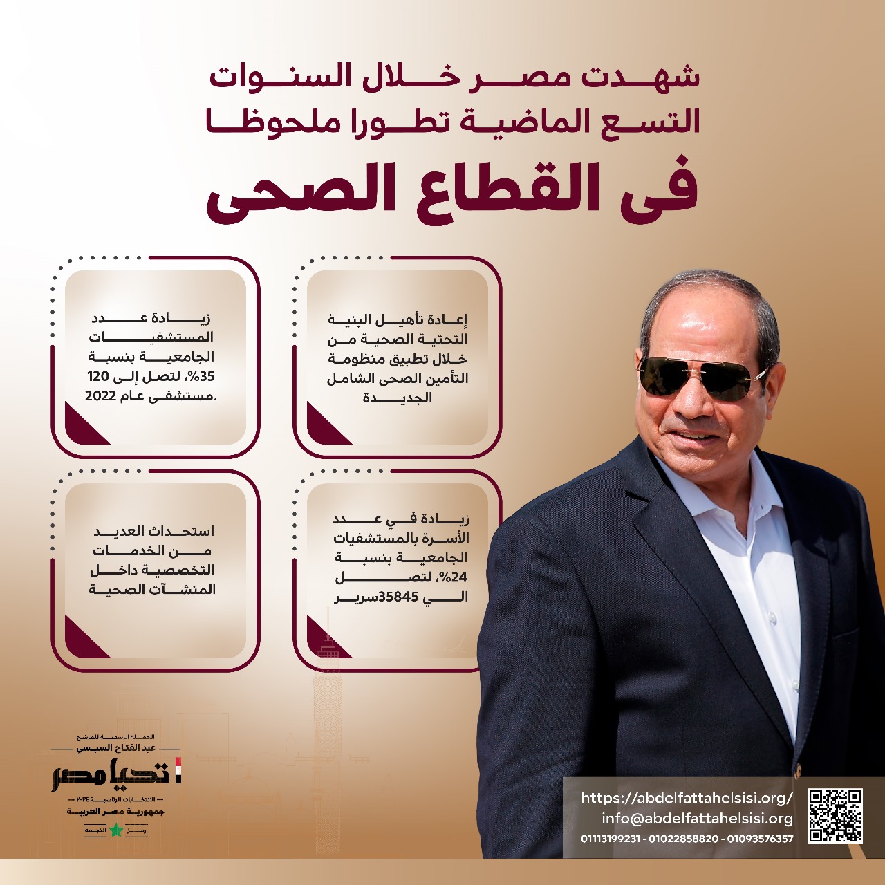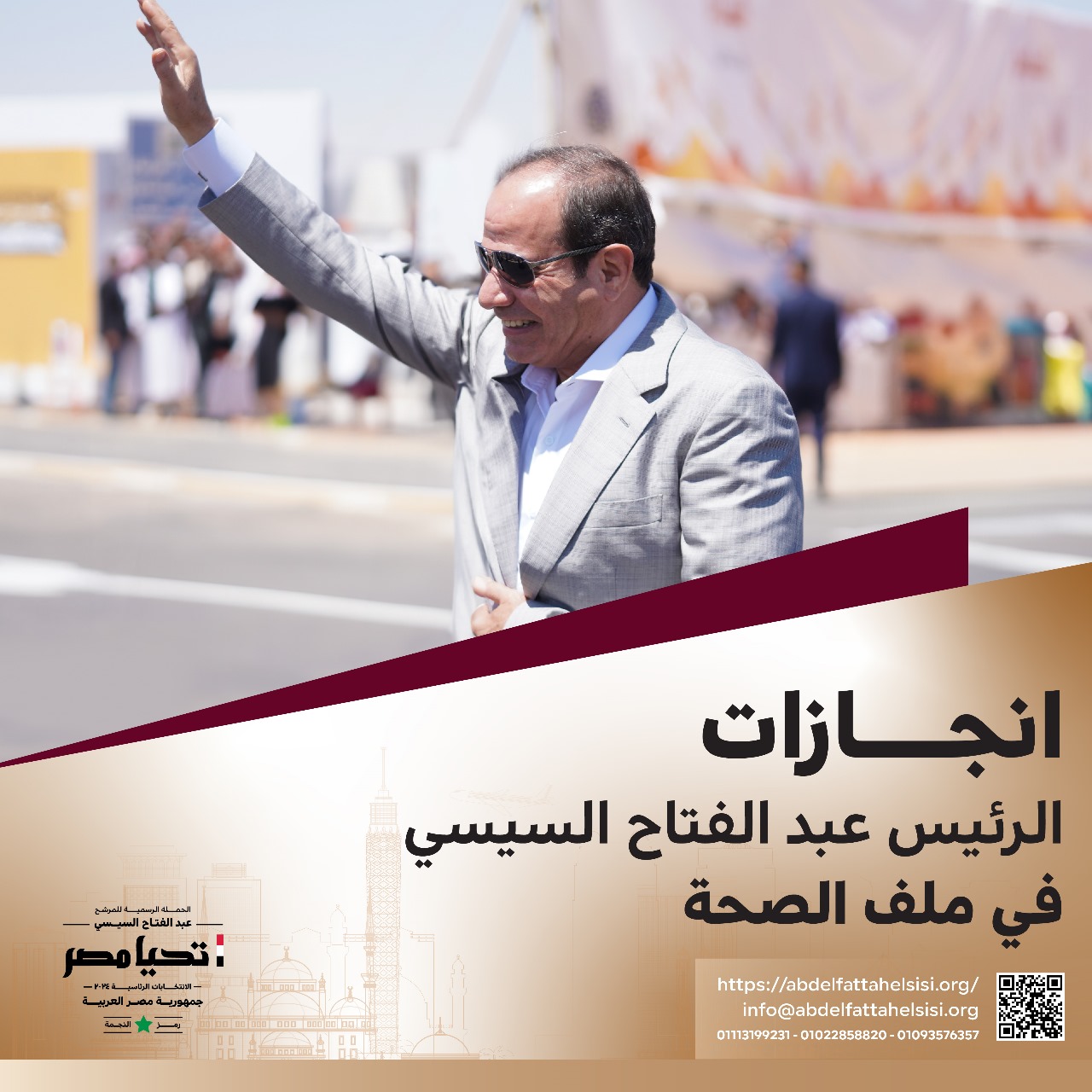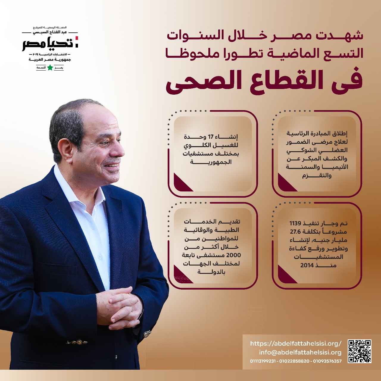 وكتبت الحملة على صفحتها الرسمية على "فيس بوك:"إنجازات فعّالة وعملٍ ملموس.. نال ملف الصحة في مصر الاهتمام القوي والاولوية الكبيرة من الرئيس عبد الفتاح السيسي خلال السنوات التسع الماضية".