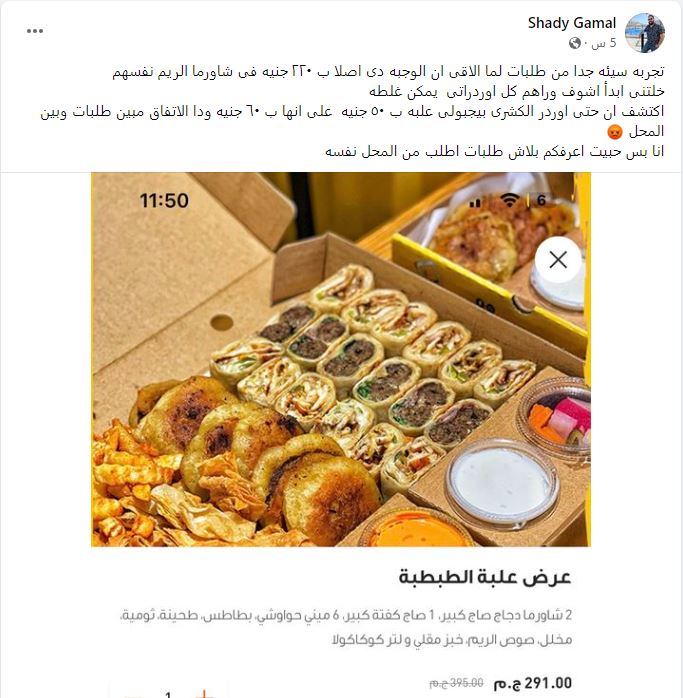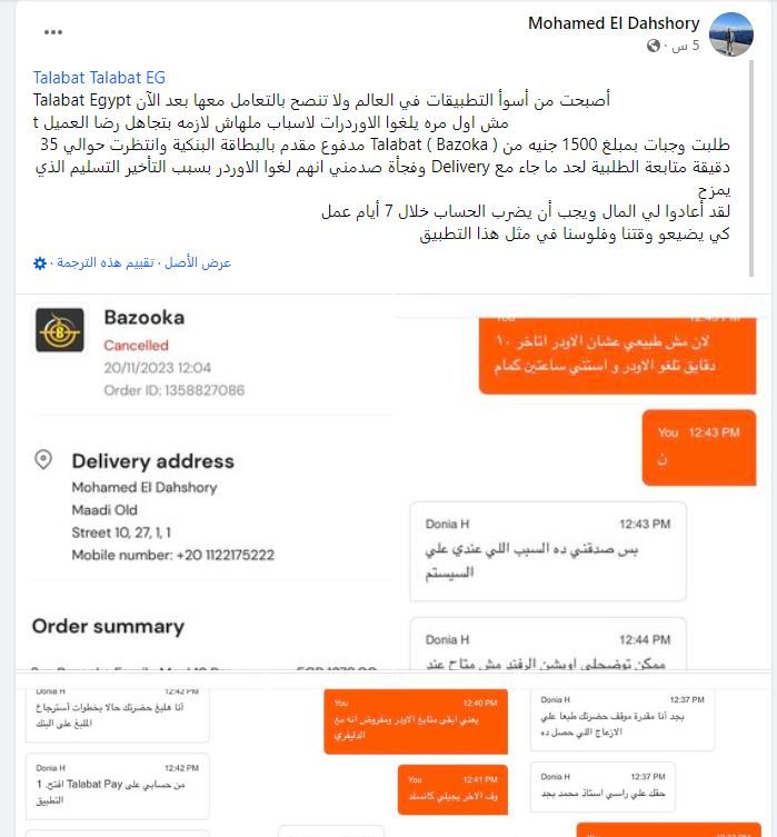 وتابع فى شكواه على وسائل التوصال الاجتماعى ،" طلبت وجبات بمبلغ 1500 جنيه من Talabat ( Bazoka ) مدفوع مقدم بالبطاقة البنكية وانتظرت حوالي 35 دقيقة متابعة الطلبية لحد ما جاء مع Delivery وفجأة صدمني انهم لغوا الاوردر بسبب التأخير التسليم ".