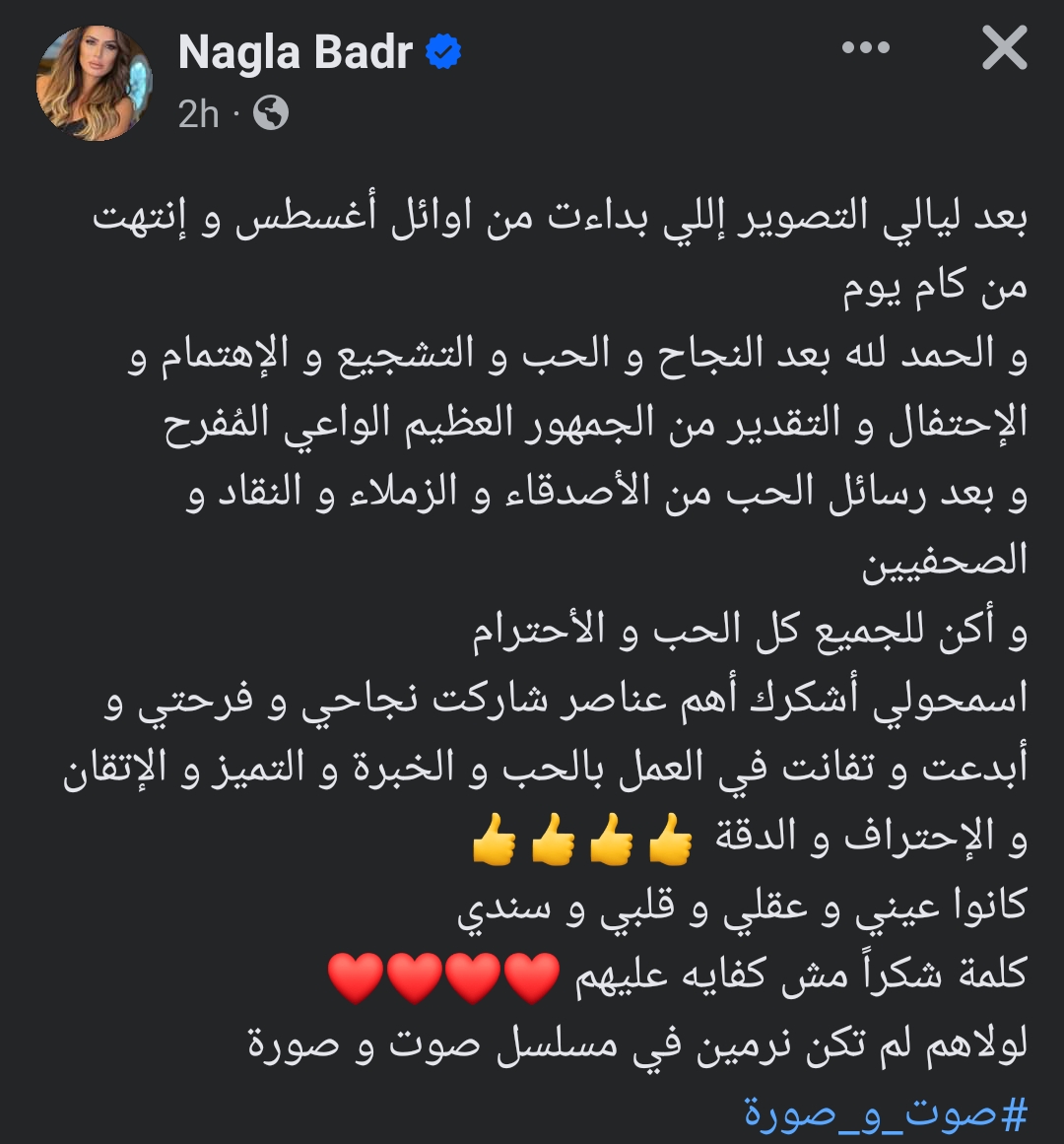 أشادت الفنانة نجلاء بدر بصناع مسلسل صوت وصورة وذلك بعد النجاح الكبير الذي حققه المسلسل ونال المسلسل إشادات كبيرة من الجمهور والنقاد .