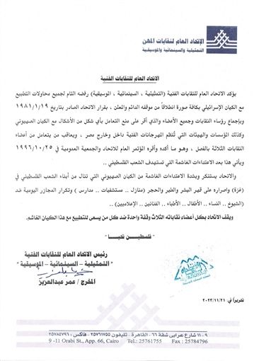 الاتحاد العام للنقابات الفنية يصدر بيان برفض محاولات التطبيع مع الكيان الإسرائيلي