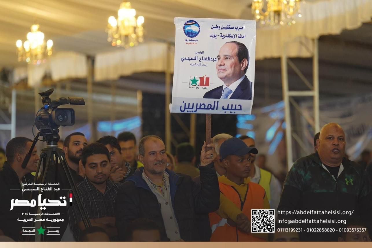 نظمت أمانة حزب مستقبل وطن بمحافظة الإسكندرية 21 نوفمبر 2023 م، مؤتمراً جماهيرياً حاشداً لدعم المرشح الرئاسي عبد الفتاح السيسي في الانتخابات الرئاسية المقبلة2024 م، وذلك بحضور أعضاء الحزب، وكبار الشخصيات العامة، وبمشاركة عدد كبير من الشباب والمرأة، وبحضور عدد كبير من فئات الشعب المصري الذي يقدر عددهم حوالي 7 آلاف مواطن مصري.