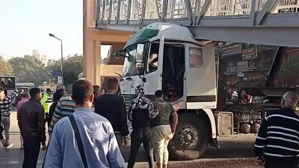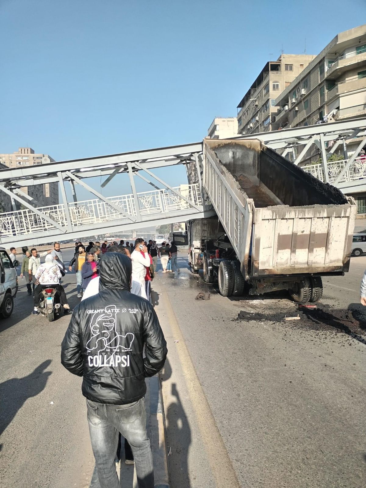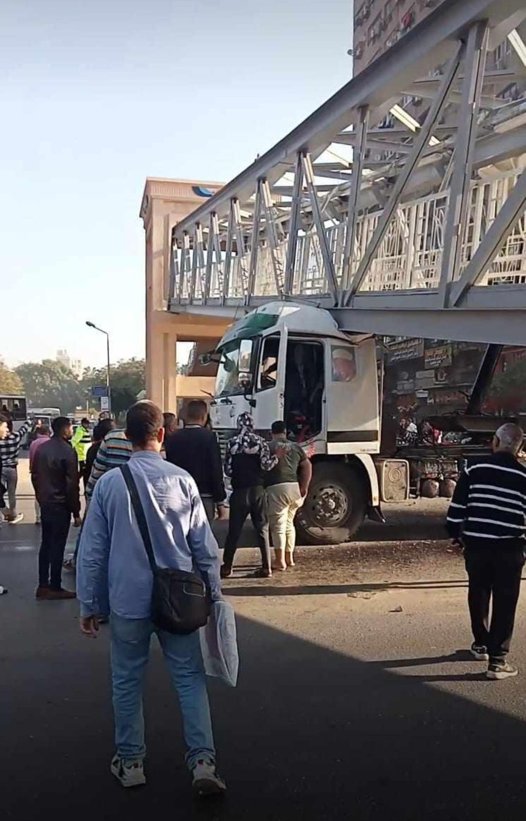 دخل فيه تريلا.. سقوط جزئي لـ كوبري المشاة بشارع أحمد عرابي بالمهندسين (صور)