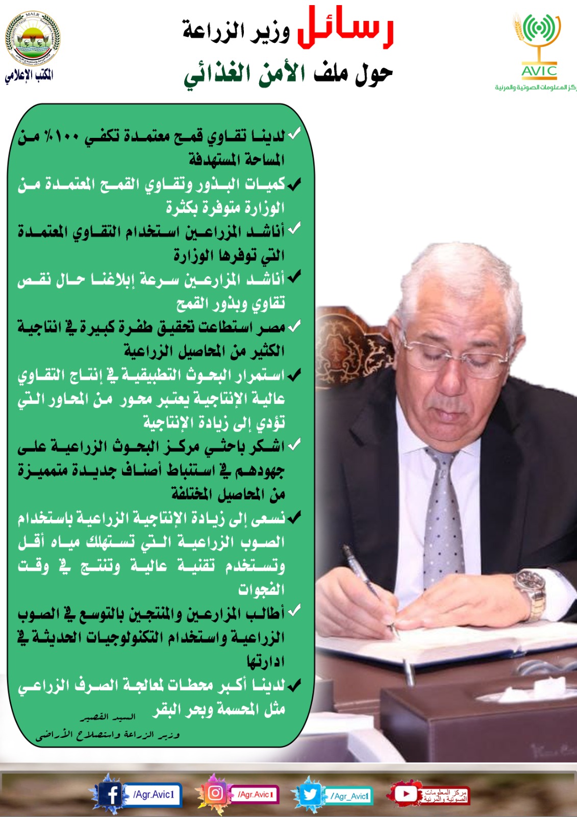 أصدر مركز المعلومات الصوتية والمرئية بوزارة الزراعة واستصلاح الأراضي، انفوجرافاً حمل عدة رسائل من السيد القصير وزير الزراعة واستصلاح الأراضي، حول ملف الأمن الغذائي.