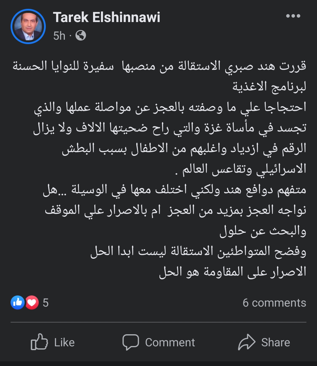 هند صبري .. كتب طارق الشناوي منشور على صفحته الرسمية عبر موقع التواصل الاجتماعي "فيسبوك" وعلق قائلا " قررت هند صبري الاستقالة من منصبها سفيرة للنوايا الحسنة لبرنامج الأغذية احتجاجا على ما وصفته بالعجز عن مواصلة عملها والذي تجسد في مأساة غزة والتي راح ضحيتها الآلاف ولا يزال الرقم في ازدياد وأغلبهم من الأطفال بسبب البطش الإسرائيلي وتقاعس العالم " .