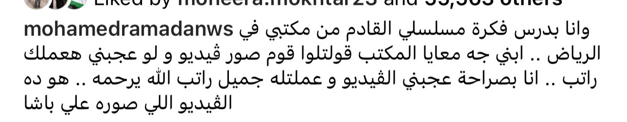 وقال محمد رمضان ،" وأنا بدرس فكرة مسلسلي القادم من مكتبي في الرياض .. ابني جه معايا المكتب قولتلوا قوم صور ڤيديو و لو عجبني هعملك راتب .. انا بصراحة عجبني الڤيديو و عملتله جميل راتب الله يرحمه .. هو ده الڤيديو اللي صوره علي باشا".