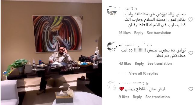 وقال أحد المتابعين." إيه اللى جنبك ده بيبسي.. انت ما تعرفش إنه من المقاطعة"، وقال آخر “ عيب عليك تشرب بيبسى روح امسك سلاح أحسن”.