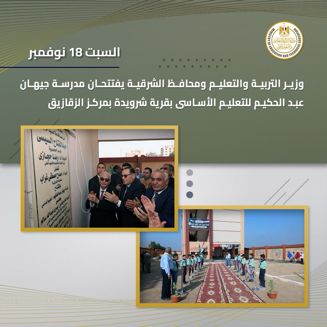 افتتح الدكتور رضا حجازي وزير التربية والتعليم والتعليم الفني، والدكتور ممدوح غراب محافظ الشرقية، مدرسة جيهان عبد الحكيم للتعليم الأساسى بقرية شرويدة، التابعة لمركز الزقازيق بمحافظة الشرقية، وذلك في إطار جهود الوزارة في تقديم تعليم جيد لأبنائها الطلاب في المحافظة، وإنشاء مدارس جديدة تساهم في تقليل الكثافة الطلابية داخل الفصول.