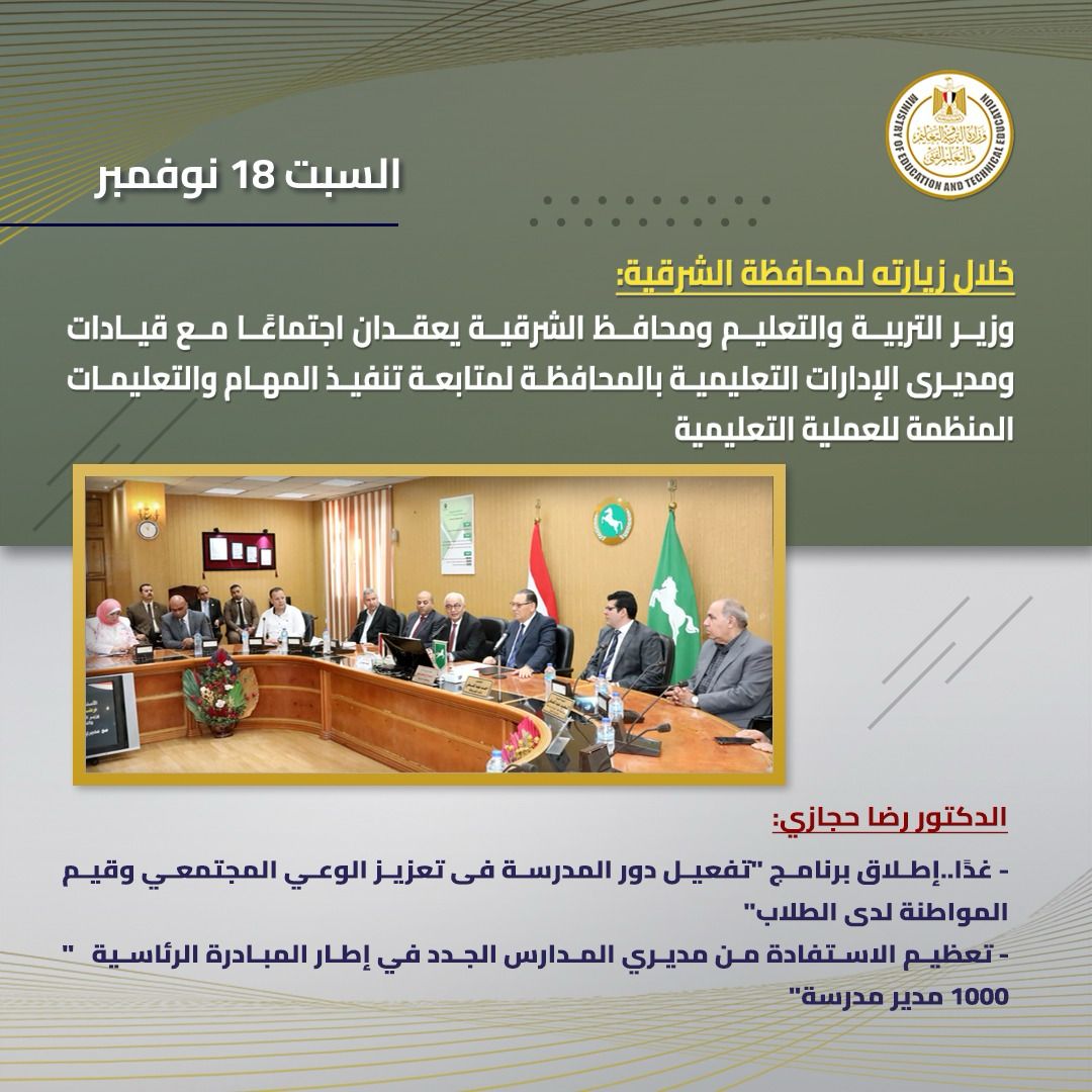 عقد الدكتور رضا حجازى وزير التربية والتعليم والتعليم الفنى، والدكتور ممدوح غراب محافظ الشرقية اجتماعًا بقيادات التربية والتعليم، ومديرى الإدارات التعليمية، بديوان المحافظة؛ للوقوف على الإجراءات المتعلقة بانضباط وانتظام العام الدراسي، وتنفيذ المهام والتعليمات المنظمة للعملية التعليمية.
