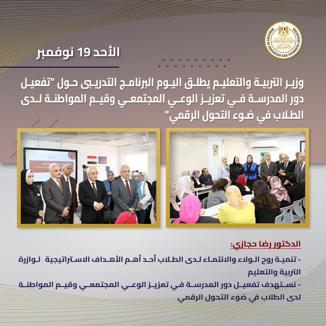 أطلق الدكتور رضا حجازى وزير التربية والتعليم والتعليم الفنى، البرنامج التدريبي حول "تفعيل دور المدرسة في تعزيز الوعي المجتمعي وقيم المواطنة لدى الطلاب في ضوء التحول الرقمي" والذي يتم تنفيذه على مستوى الجمهورية لمدة 3 أيام، ابتداءً من اليوم الأحد وحتى 21 نوفمبر2023