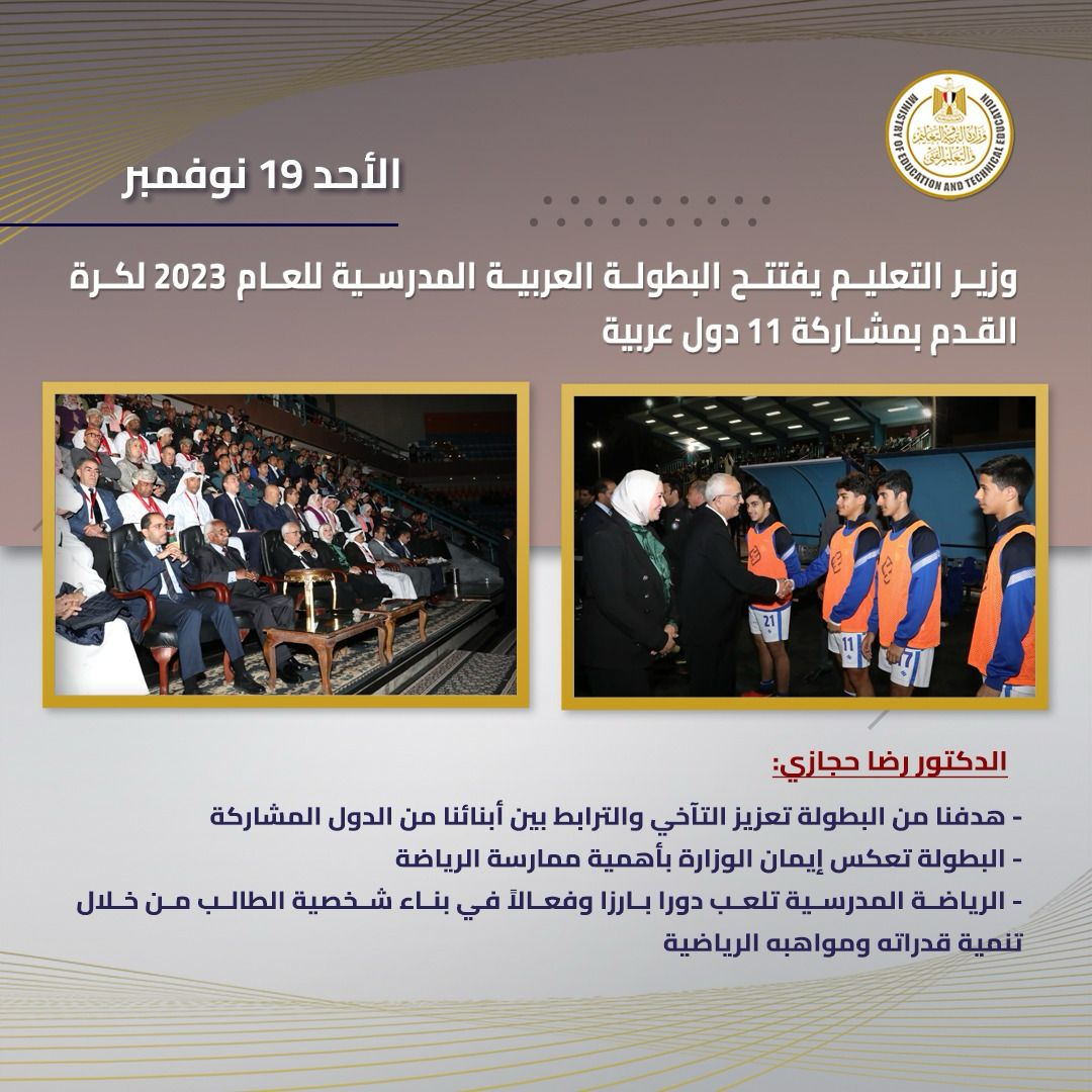 افتتح الدكتور رضا حجازي وزير التربية والتعليم والتعليم الفني فعاليات البطولة العربية المدرسية للعام 2023 لكرة القدم (بنين-بنات)، والتي ينظمها الاتحاد المصري للرياضة المدرسية، بالتعاون مع الاتحاد العربي للتربية البدنية والرياضة المدرسية، والتى تستضيفها مصر خلال الفترة من 17 إلى 27 نوفمبر الجاري في كرة القدم والسباحة، بنادى اتحاد الشرطة الرياضى.