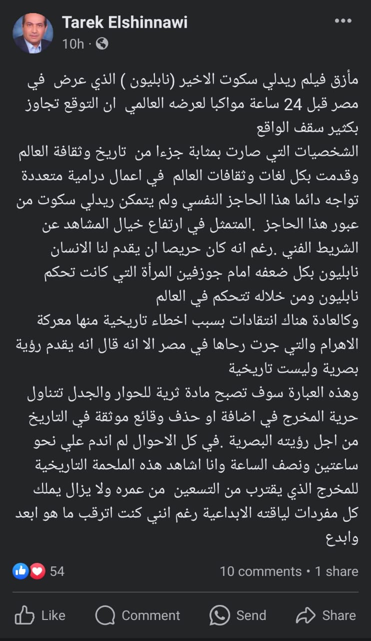 كتب الناقد الفني طارق الشناوي منشور على صفحته الرسمية عبر موقع التواصل الاجتماعي " فيسبوك " وعلق " مأزق فيلم ريدلي سكوت الأخير (نابليون) الذي عرض في مصر قبل 24 ساعة مواكبا لعرضه العالمي أن التوقع تجاوز بكثير سقف الواقع " .