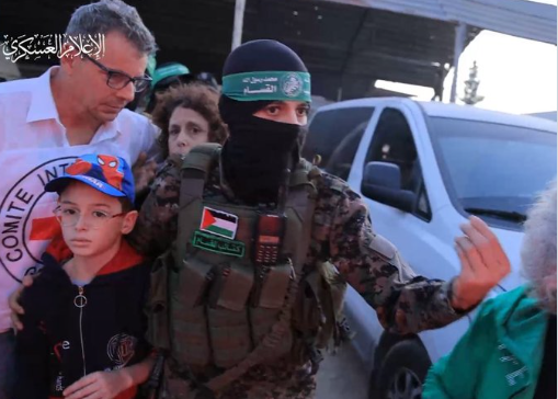 تداول نشطاء على مواقع التواصل الاجتماعي، مقاطع فيديو للحظة تسليم عناصر من كتائب القسام (الجناح العسكري لحركة حماس) للأسري ضمن اتفاق هدنة بين إسرائيل والحركة يمتد لأربع أيام.