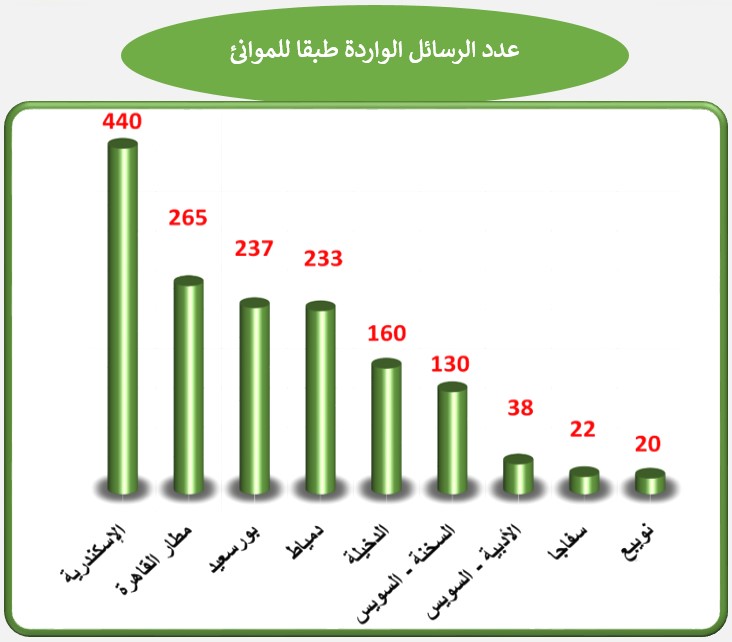 وتصدر ميناء الإسكندرية الأسبوع الماضي أيضًا المركز الأول في عدد الرسائل الغذائية الواردة إليه بإجمالي 440 رسالة، يليه ميناء مطار القاهرة والذي احتل المركز الثاني بـ 265 رسالة، ثم ميناء بور سعيد بإجمالي 237 رسالة.