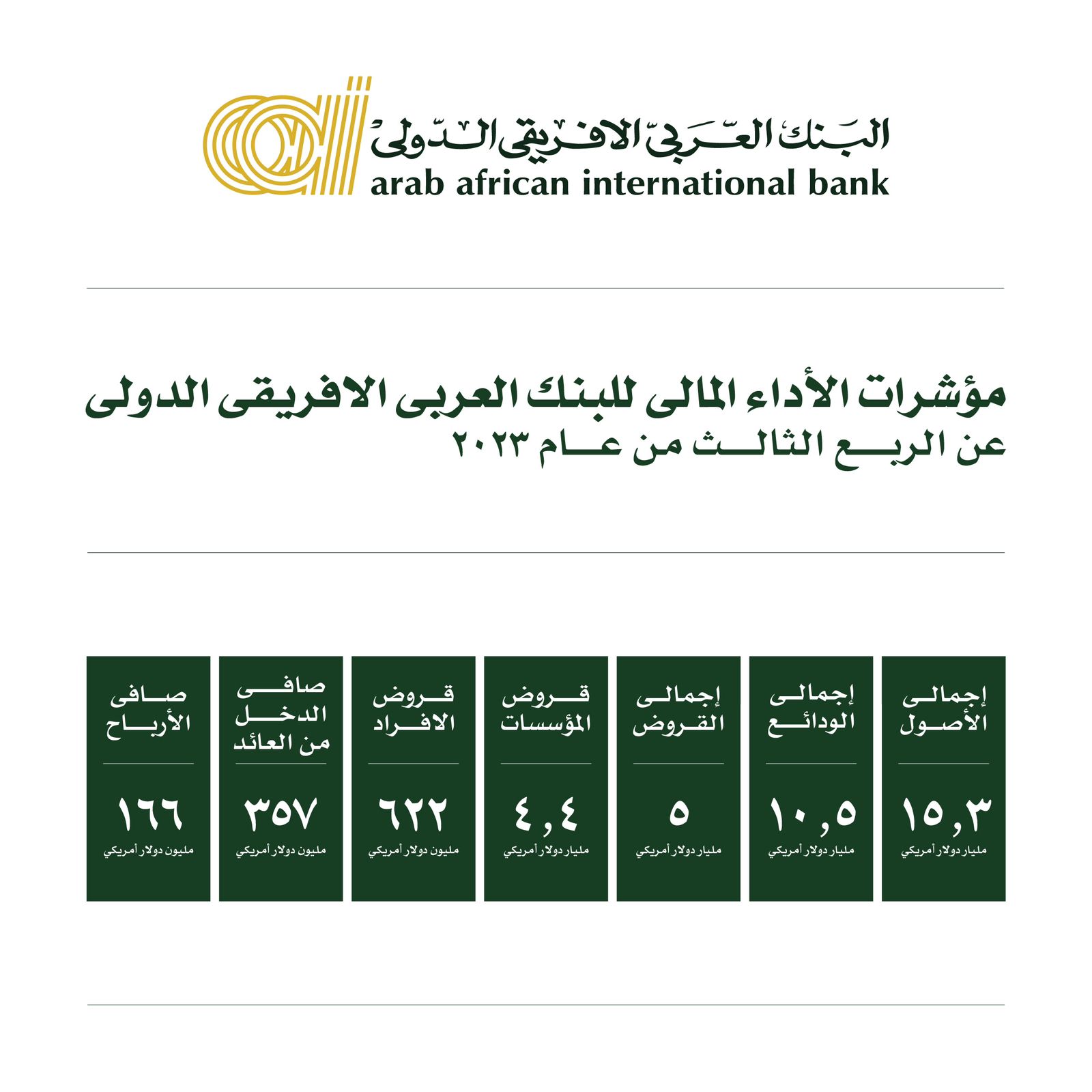 البنـك العـربـي الافـريقـي الـدولـي يكشف عن أدائه المالي بنهاية الربع الثالث من العام 2023