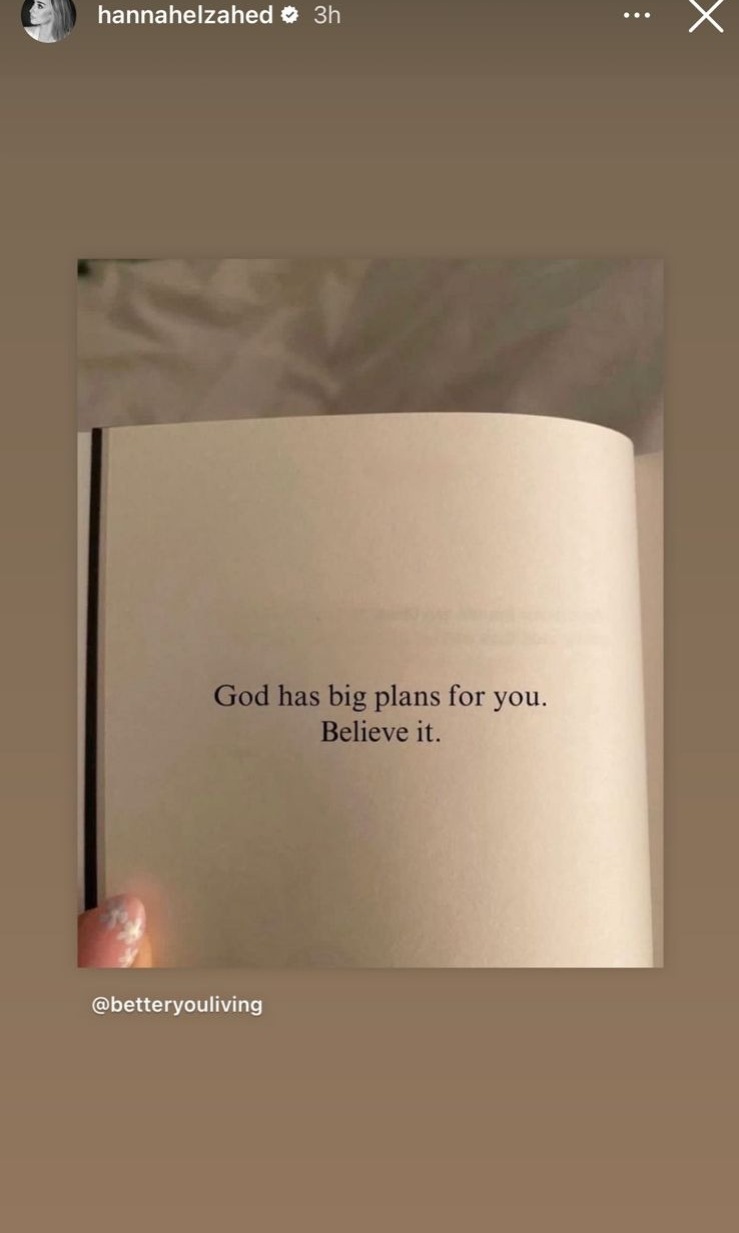 علقت هنا الزاهد، بعد انفصالها عن أحمد فهمي، نشرت ستوري عبر حسابها الرسمي بموقع تبادل الصور والفيديوهات انستجرام، عبر خاصية “ستوري” قالت فيها:"الله لديه الخطط الكبيرة بالنسبة لك صدق ذلك".