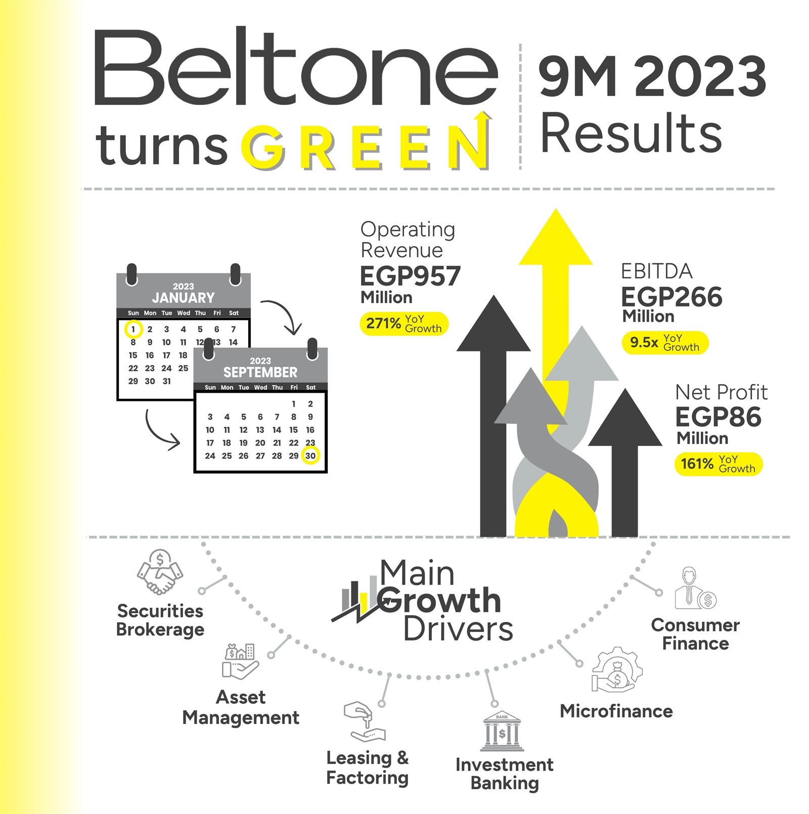 شهدت النتائج المالية تحولًا كبيرًا خلال الفترة، حيث بدأت الشركة في جني ثمار إستراتيجيها، فقد حققت الشركة إيرادات تشغيل قياسية بقيمة 957 مليون جنية خلال الفترة المالية المنتهية في 30 سبتمبر 2023، بزيادة قدرها 271% على أساس سنوي، نتيجة للنمو القوي في إيرادات الأنشطة المالية غير المصرفية، مدعومه بإيرادات بنك الإستثمار.