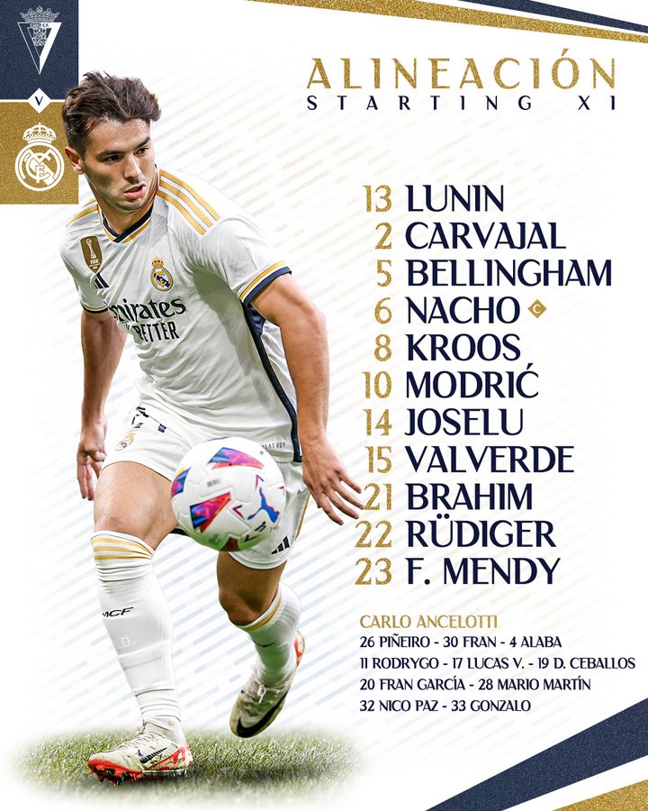 خط الوسط: بيلينجهام، كروس، مودريتش، سيبايوس، فالفيردي، نيكو باز ، مارتين.