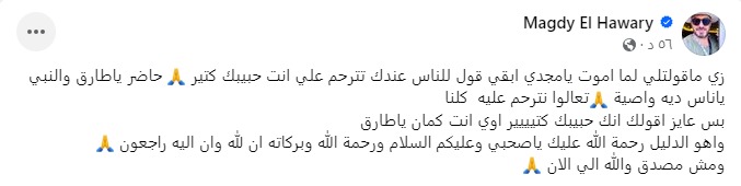 وكتب مجدي الهواري عبر صفحته الشخصية على موقع التواصل الاجتماعي "فيس بوك": "زي ماقولتلي لما اموت يامجدي ابقي قول للناس عندك تترحم علي انت حبيبك كتير حاضر يا طارق والنبي ياناس ديه وصية تعالوا نترحم عليه كلنا بس عايز أقولك انك حبيبك كتيييير أوي أنت كمان ياطارق"