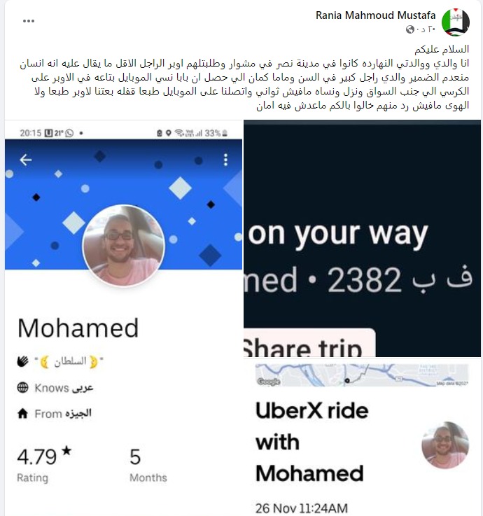 وقالت الفتاة فى مشكلتها التى عرضتها عبر السوشيال ميديا ،" انا والدي ووالدتي النهارده كانوا في مدينة نصر في مشوار وطلبتلهم اوبر الراجل الاقل ما يقال عليه انه انسان منعدم الضمير والدي راجل كبير في السن وماما كمان الي حصل ان بابا نسي الموبايل بتاعه في الاوبر على الكرسي الي جنب السواق ونزل ونساه مافيش ثواني واتصلنا على الموبايل طبعا قفله بعتنا لاوبر طبعا ولا الهوى مافيش رد منهم خالوا بالكم ماعدش فيه امان".